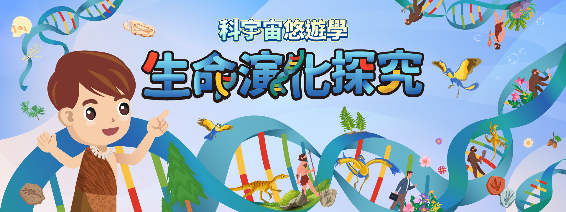 科博小隊開啟探究生命的旅途,找尋演化的線索,探討植物、動物到人類萬物的歷史演化,追溯古今的演變,從生物特徵到生存方式的演進,深入理解萬物演化的奧秘,掌握物種如何在地球生存、適應與轉變。